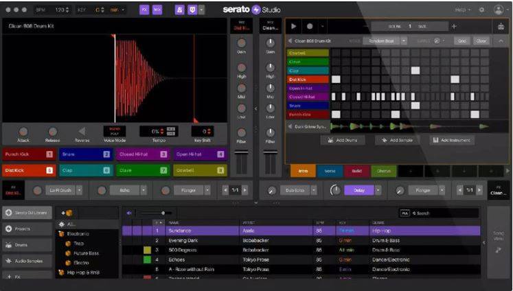 使用Serato Studio庫中的聲音來構建您的節拍:例如,您可以選擇鼓組,然後您可以選擇鼓模式以獲得特定風格的音樂,例如陷阱,嘻哈或者房子。